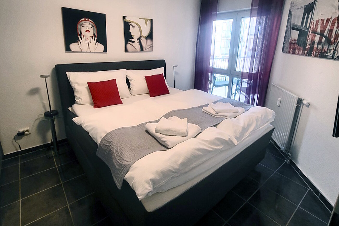 Schlafzimmer mit Boxspringbett (180x200cm) mit einer durchgehenden Matratze, großem Spiegelschrank und LCD-Fernseher. Modernes Bad mit großer Dusche und WC. Balkon mit Tisch und 2 Stühlen.