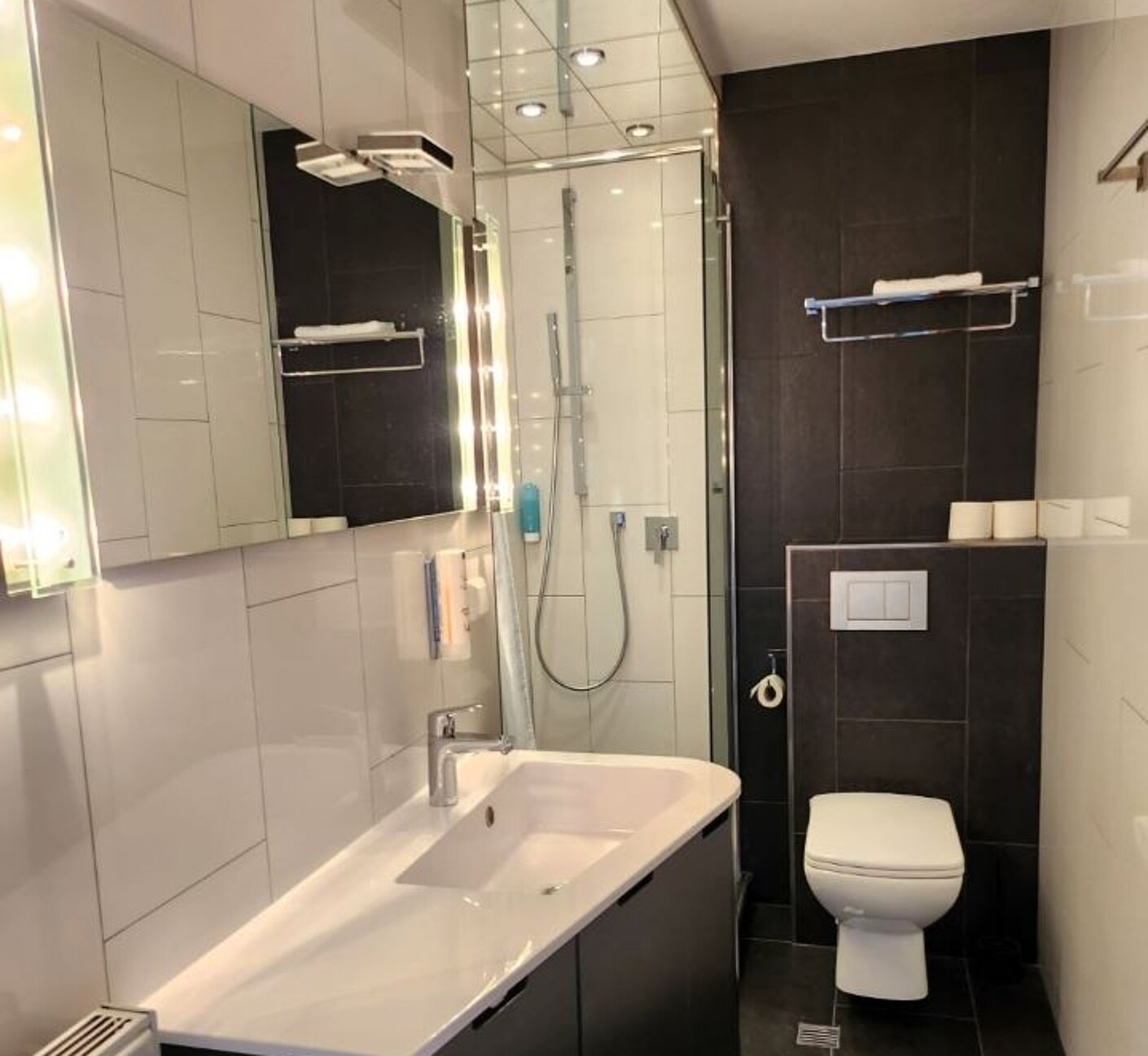 In dem gepflegten, exklusiv ausgestatteten Appartement erwartet Sie ein geräumiges Wohnzimmer mit Sofa, Fernsehgerät und Essecke, eine neu ausgestattete, separate Küche mit Geschirrspüler, Induktionskochfeld, Backofen mit eingebauter Mikrowelle, Kühl-Gefrierkombination und kompletter Geschirrausstattung, ein modernes Schlafzimmer mit Spiegelschrank und 2 x 2 Meter großem Boxspringbett sowie einem weiteren Fernsehgerät, ein Bad mit großer Dusche und WC. Ihr gemütliches Zuhause in Bad Kreuznach erreichen Sie bequem mit dem Fahrstuhl; Ihr Wagen und Ihre Fahrräder sind in der Tiefgarage gut aufgehoben.