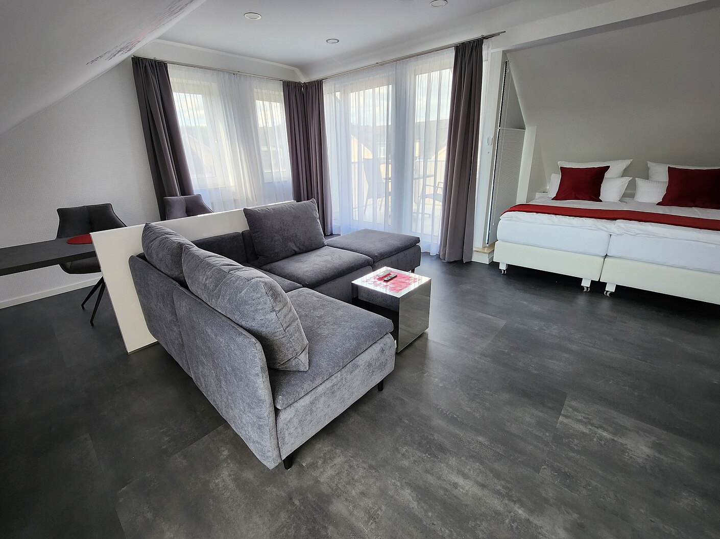 Das gepflegte, exklusiv ausgestattete Apartment bietet Ihnen ein lichtdurchflutetes Wohn-Schlaf-Zimmer mit Sitzecke und einem hochmodernen Fernsehgerät. Zum Essen und – falls Sie im Urlaub nicht darauf verzichten können, auch zum Arbeiten – gibt es einen großzügigen Tisch mit Zugriff auf Steckdosen und USB-Anschlüsse. Eine weitere ausziehbare Arbeitsplatte finden Sie im geräumigen Einbauschrank, der auch genügend Stauraum für Ihr Gepäck bietet.