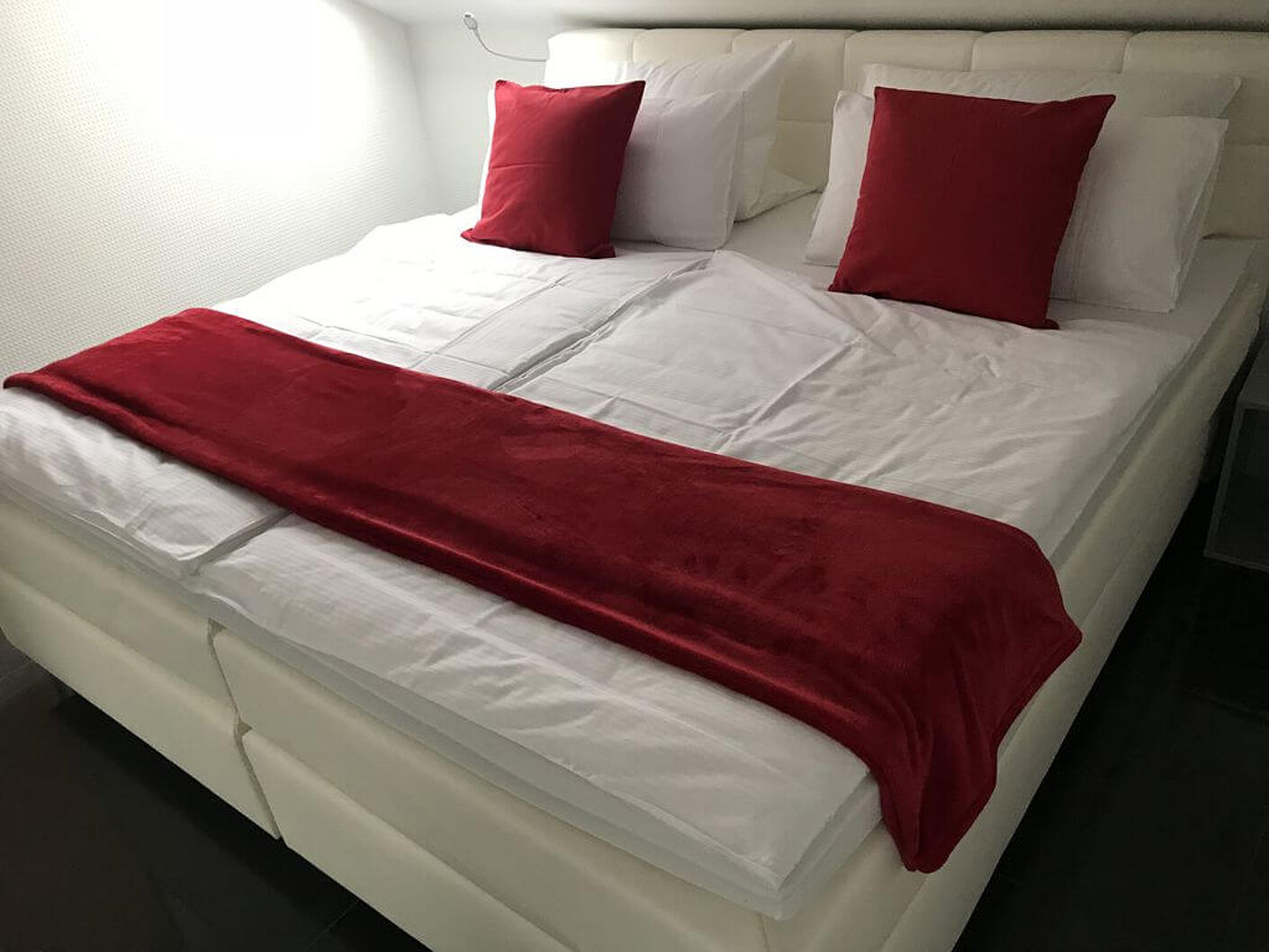 - Schlafzimmer mit Boxspringbett; Fernsehgerät im Einbauschrank integriert